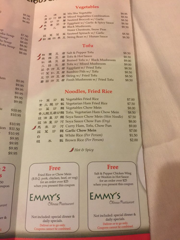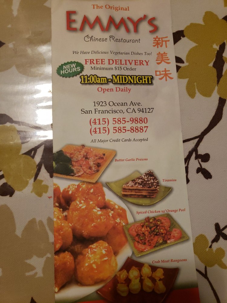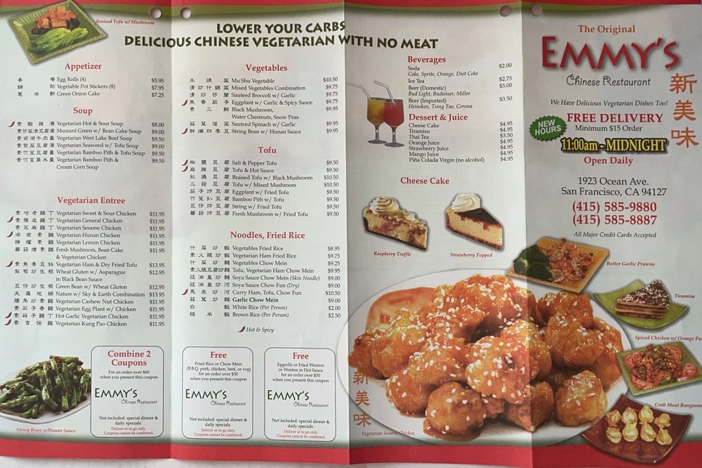 Emmy’s Restaurant, located in San Francisco, offers a diverse menu with vegan and vegetarian options. The restaurant provides various utilities such as reservations, delivery, and catering services. The ambiance is casual with moderate noise levels, suitable for groups and children. Customers praise the friendly staff and tasty food, with popular dishes like green onion cake, fried prawns, and strawberry cheesecake receiving rave reviews. The beverages menu includes unique options like Thai tea and freshly brewed juices. Desserts like tiramisu and raspberry truffle cheesecake are also highly recommended. Overall, Emmy’s Restaurant is a reliable spot for Chinese cuisine with a twist, earning consistently excellent reviews from satisfied diners.
